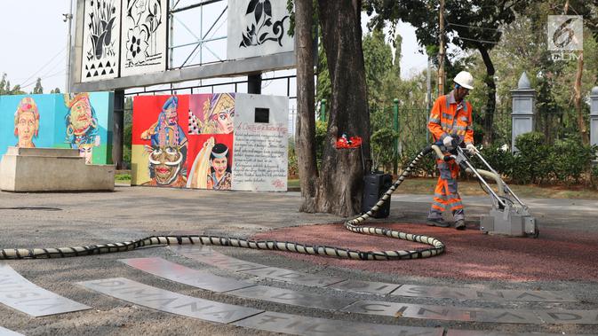 Petugas membersihkan alat ThruKlin usai membersihkan beton berpori di area Taman Pandang Istana, Jakarta, Kamis (2/8). Beton berpori digunakan pada beberapa proyek revitalisasi, salah satunya kawasan SUGBK. (Liputan6.com/Helmi Fithriansyah)