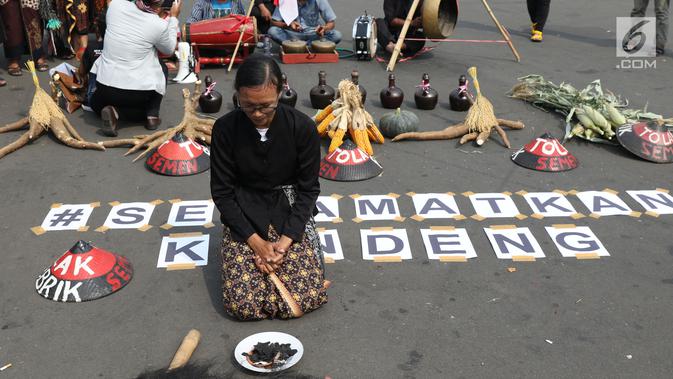 Dalam aksinya, petani Kendeng melakukan tradisi Brokohan atau makan bersama nasi aneka urap yang sebelumnya didoakan.