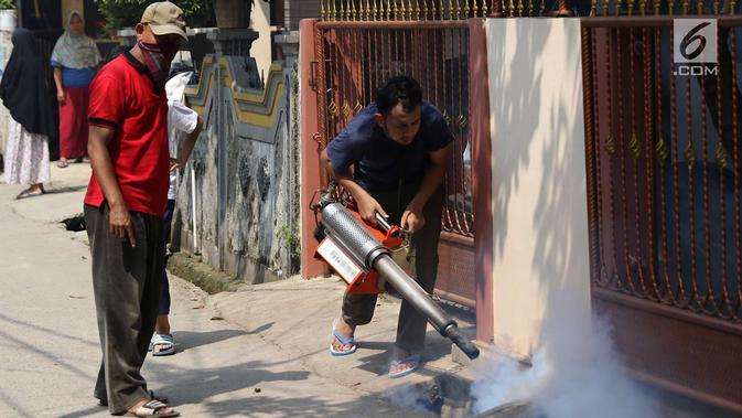 Warga melakukan pengasapan atau fogging di kawasan Kukusan, Depok, Jawa Barat, Senin (3/9). Pengasapan dilakukan guna mengurangi risiko penyakit demam berdarah akibat gigitan nyamuk aedes aegypti. (Liputan6.com/Immanuel Antonius)