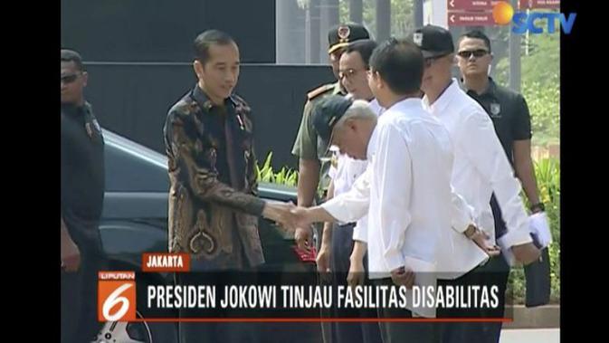 Liputan6.com, Jakarta - Presiden Joko Widodo atau Jokowi didampingi Gubernur DKI Jakarta Anies Baswedan dan sejumlah menteri meninjau fasilitas disabilitas di sekitar kompleks Gelora Bung Karno (GBK), Jakarta.