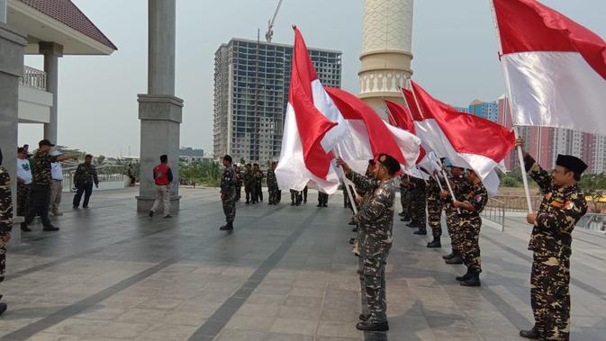 Liputan6.com, Jakarta - Ketua Pengurus Wilayah Gerakan Pemuda Ansor DKI Jakarta Abdul Azis, menerima 17 Bendera Merah Putih dari zona Sabang di halaman Masjid KH Hasyim As'ari. Bendera itu awalnya diterima oleh Dewan Kemakmuran Masjid (DKM) KH Hasyim As'ari KH Zuhri Yakub, yang kemudian diserahkan ke Abdul Azis.