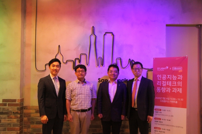 | 조현민 코메이크 대표와 임준호 한국전자통신연구원 책임연구원, 이경전 경희대학교 교수, 조원희 법무법인 디라이트 변호사가 '인공지능과 리걸테크 동향 및 과제에 대한 온라인 컨퍼런스' 종료 후 기념촬영을 하고 있다./사진=코메이크 |