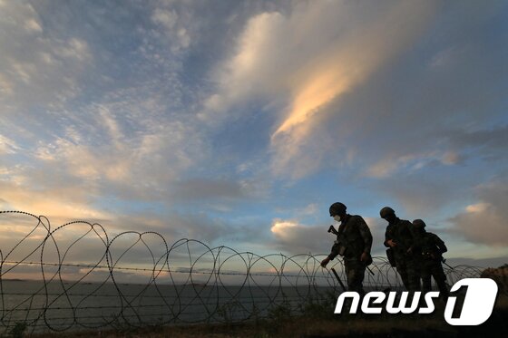 | 24일 오후 인천 옹진군 대연평도에서 해병대 장병들이 해안 순찰을 하고 있다.2020.9.24/뉴스1 © News1 구윤성 기자 |