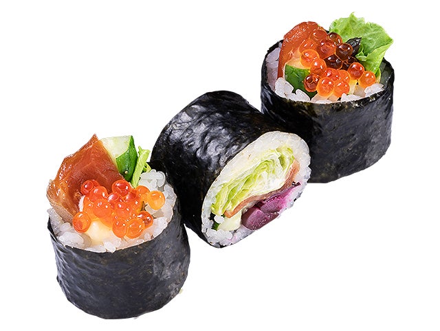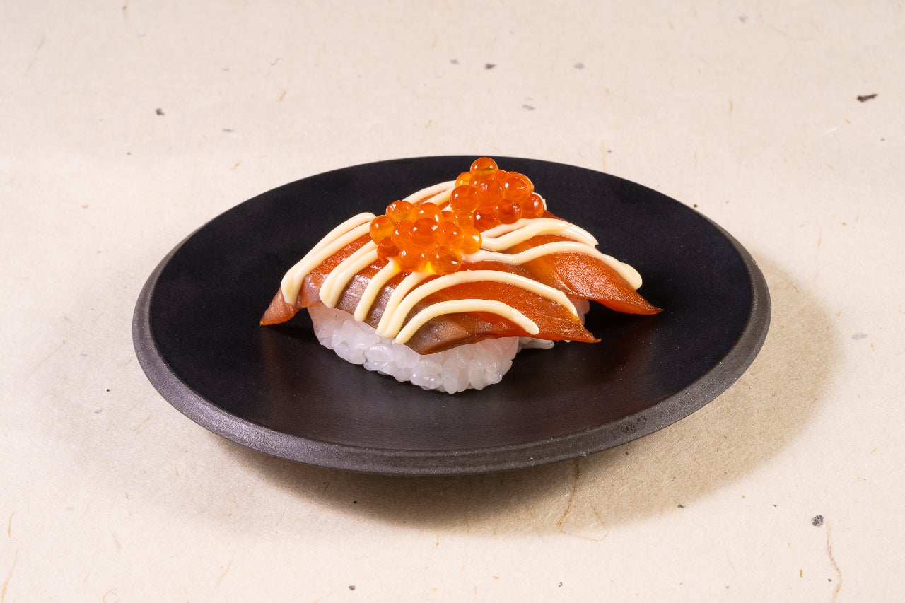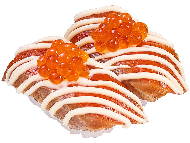 かっぱ寿司の定番人気ネタの「サーモン」を、大将 佐々木氏こだわりの「漬け地」を具現化した「特製漬けだれ」で漬けにしました。「いくら」の食感と旨み、本商品専用のマヨネーズのまろやかな味わいが加わった、モダンなにぎり寿司です。