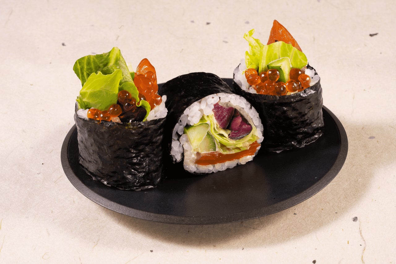 京都三大漬物のひとつ「しば漬け」をフレッシュ野菜とともに巻き込んだ京風サラダ巻きです。