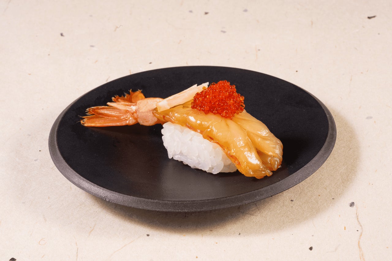 『赤えびの“よっぱらい海老”風にぎりとびこのせ』