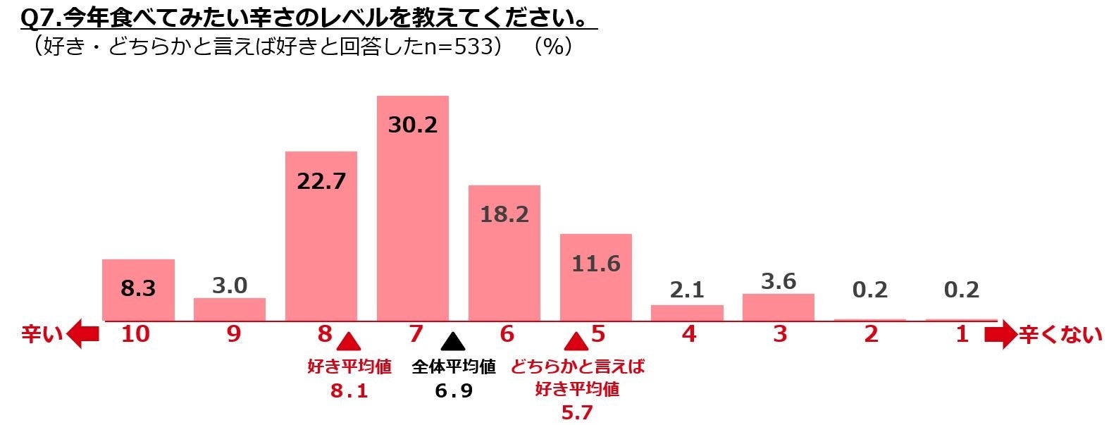 今年食べてみたい辛さのレベルは平均6.9となりましたが、「好き」と回答した人は平均8.1。その内の3割弱が10と回答しており、好きな人ほど辛さを追求している傾向がみられました。