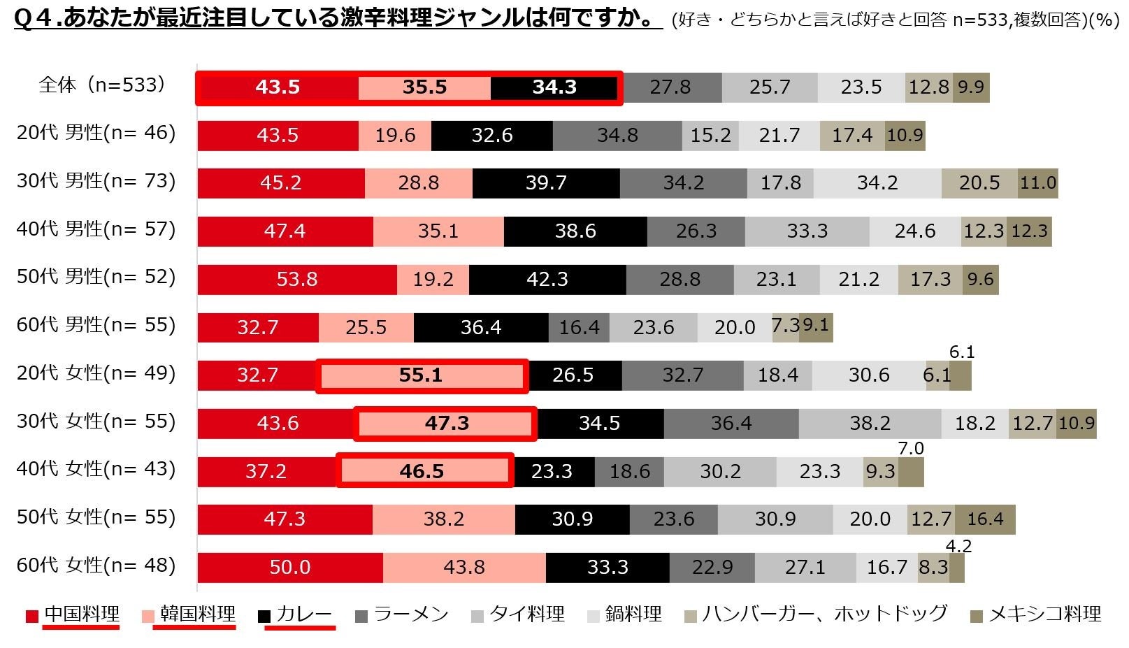 ここ数年は辛さだけではなくうま味を感じる「激辛料理」を求める傾向がみられますが、今年新たに追加した「辛さと胡椒や山椒などの香りと刺激が際立つ味」も3位にランクイン。食べたくなる理由2位の「刺激や達成感を味わいたいから」と繋がっているのかもしれません。