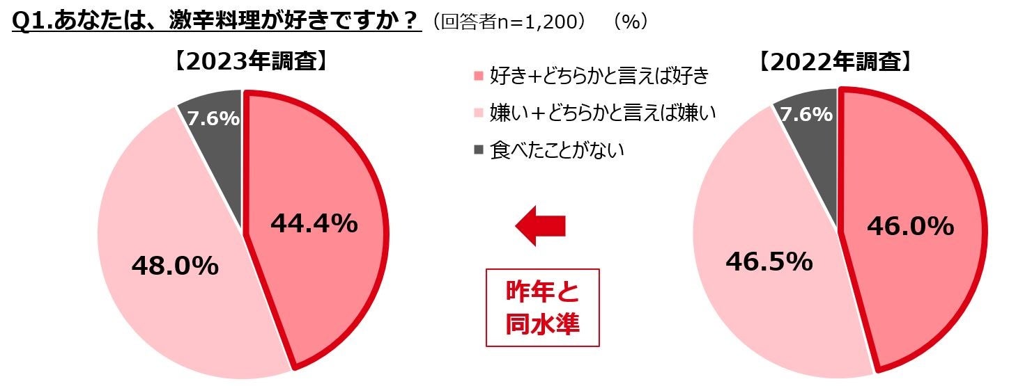 ・激辛料理が好きな人は44.4%で、昨年と同水準。