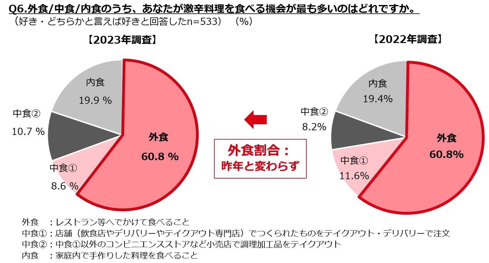 外食で「激辛料理」を楽しみたいと回答した人は昨年並みで6割。激辛料理を楽しむ場が「外食」の傾向は変わらずという結果になりました。梅雨が明け、厳しい暑さが訪れるこの夏も激辛料理ですっきりしに飲食店を訪れてみてはいかがでしょうか。