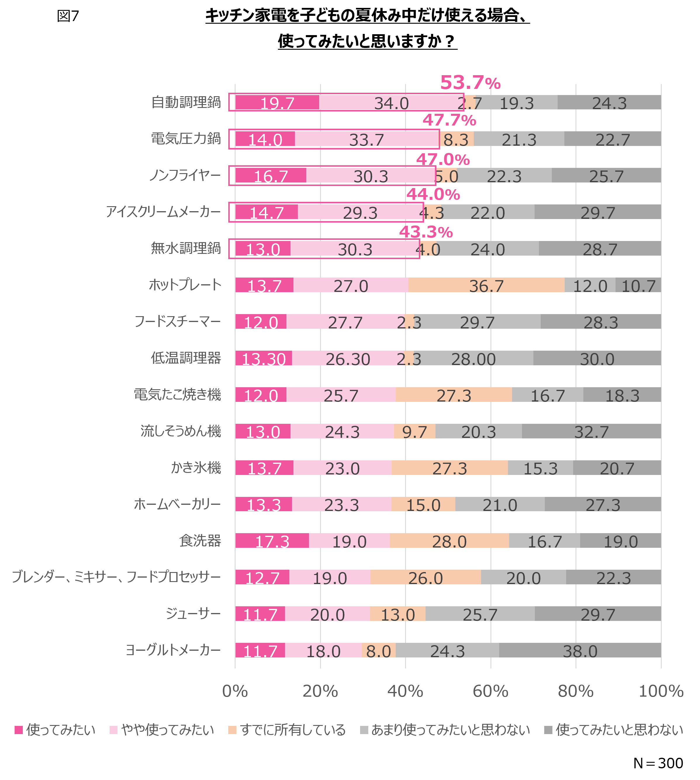 献立マンネリ化の回避策として、キッチン家電を使う方も多いと思います。子どもの夏休み中に使ってみたいキッチン家電を聞いたところ、「使ってみたい」「やや使ってみたい」合わせて「自動調理鍋」を53.7%、「電気圧力鍋」を47.7%。「ノンフライヤー」を47.7%の人が使用してみたいと回答しました(図7)。献立を増やせるもの、料理の時短に繋げられるものが人気と分かります。