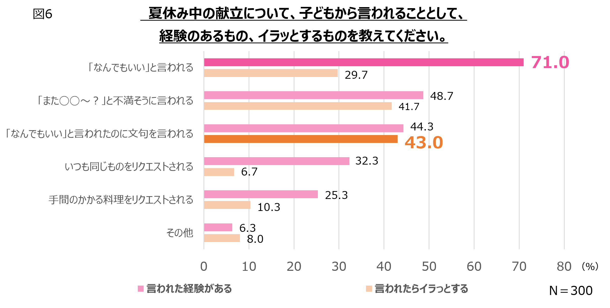 また、夏休み中の献立について、子どもから言われることとして経験のあるものを聞いたところ、「なんでもいいと言われる」が71.0%と1位に。また、言われてイラッとするものは、「なんでもいいと言われたのに文句を言われる」が43.0%と1位、「また○○~?と不満そうに言われる」が41.7%と2位となりました(図6)。