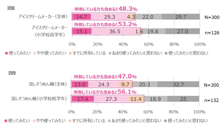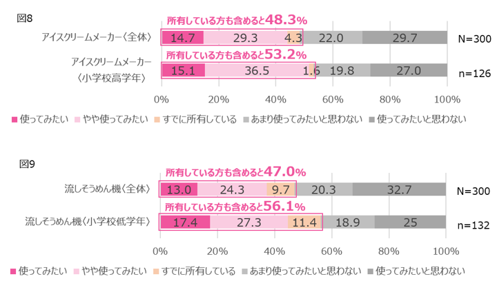 また、夏特有の楽しみである遊べるキッチン家電について、 「アイスクリームメーカー」は小学校高学年(4~6年生)の子どもをお持ちのご家庭に特に人気で、「すでに所有している」という方も含め53.2%が使ってみたいと回答(図8)。また、「流しそうめん機」は小学校低学年(1~3年生)の子どもをお持ちのご家庭に特に人気で、 「すでに所有している」という方も含め56.1%が使ってみたいと回答されました(図9)。