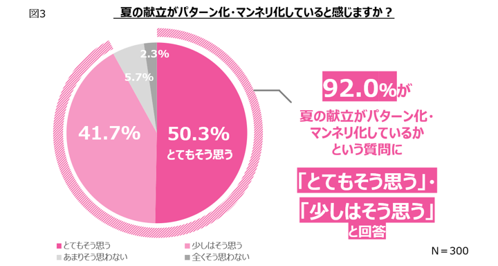 夏の献立がパターン化・マンネリ化しているか聞いたところ、「とてもそう思う」「少しはそう思う」合わせて、92.0%の人がパターン化・マンネリ化していると回答しました(図3)。献立に飽きてきている、増やしたいと感じている人が多いと推察されます。
