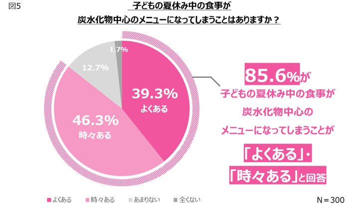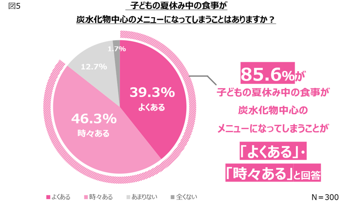 子どもの夏休み期間でも、料理にかけられる時間が大幅に増やせるわけではないという方が多いため、そうめんや焼きそばといった一品ものの炭水化物が増えてしまうという方も多いと思います。子どもの夏休み中の食事が炭水化物中心のメニューになってしまうことがあるか聞いたところ、「よくある」「時々ある」を合わせて85.6%もの人が炭水化物中心のメニューになってしまうと回答しました(図5)。