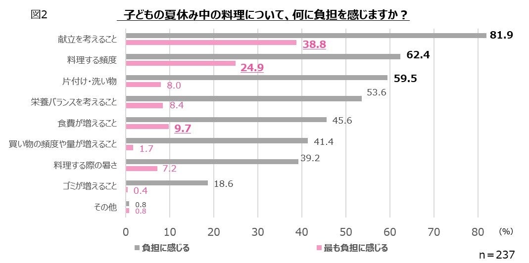 ①約8割の親が「子どもの夏休み中の料理が負担」と回答! 負担に感じること上位は「献立を考えること」「料理する頻度」 子どもが家にいる時間が増え、献立が枯渇してしまうという結果に
