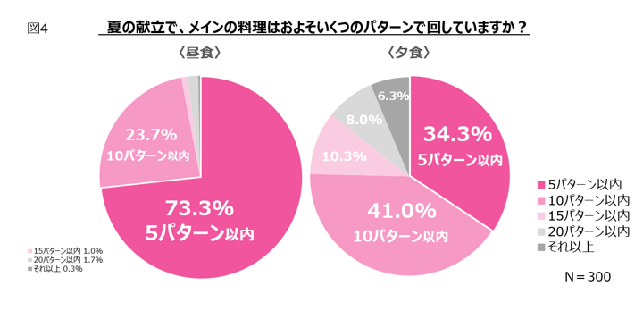 具体的に、何パターンの献立で回しているか聞いたところ、昼食は「5パターン以内」が最も多く、73.3%が回答。夕食は、「10パターン以内」が41.0%、「5パターン以内」が34.3%という結果となりました(図4)。特に昼食に関しては、普段は給食があるから作らないが夏休みは作らなければならない、普段のお弁当は前日の残り物や冷凍食品、作り置きなどで済ませているが、家で食べる昼食となるとそうもいかないなど、負担が増える人も多いと推察されます。