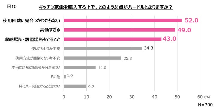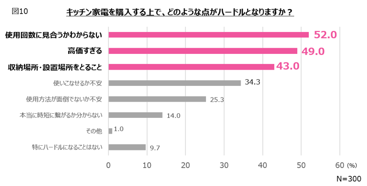 このように、キッチン家電を使ってみたいという人が多い中、使ってみたいものの持っていないものがある人はどういった点がハードルとなっているのでしょうか。キッチン家電を購入する上でどのような点がハードルとなっているか聞いたところ、「使用回数に見合うか分からない」が52.0%と1位に。次いで、「高価すぎる」が49.0%、「収納場所・設置場所をとる」が43.0%となりました(図10)。使ってみないと分からないことが多い中、高価であることが多いキッチン家電の購入を決断するのはなかなか難しいです。そのため、試してみる、必要なときだけ借りることが可能なレンタルサブスクサービスがおすすめです。
