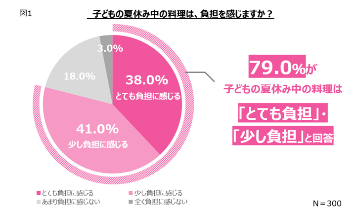 子どもの夏休み期間中の料理の負担について質問したところ、「とても負担に感じる」「少し負担に感じる」合わせて79.0%もの方が夏休み中の料理を負担に感じているという結果となりました(図1)。子どもが家にいる時間が増えることで、普段は作らないお昼ご飯を作る必要があるなど、負担が増えてしまっていると推察されます。