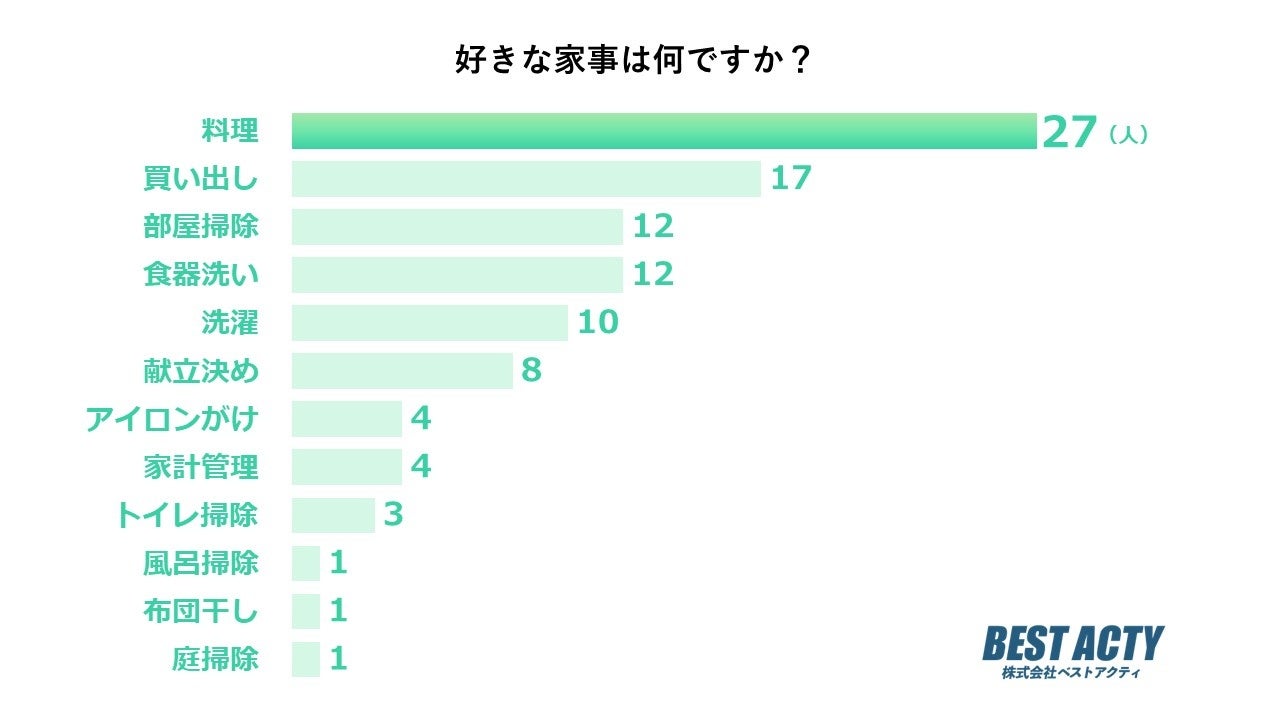 好きな家事について100人にアンケートを行ったところ、「料理」と回答する人が最も多い結果となりました。