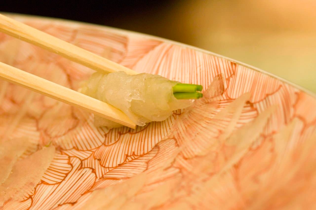シャキシャキとしたふく専用に栽培された極細の葱をふぐの身で巻くのは、下関発祥の食し方です。ピリリと辛味を効かせた紅葉おろしと春帆楼特製ぽん酢でお召し上がりいただきます。新鮮な葱の豊かな香りとぽん酢のさわやかな酸味がお口の中にいっぱいに広がり、ふくのおいしさを極上なまでに引き立てます。春帆楼ならではの食べ方でお召し上がりください。