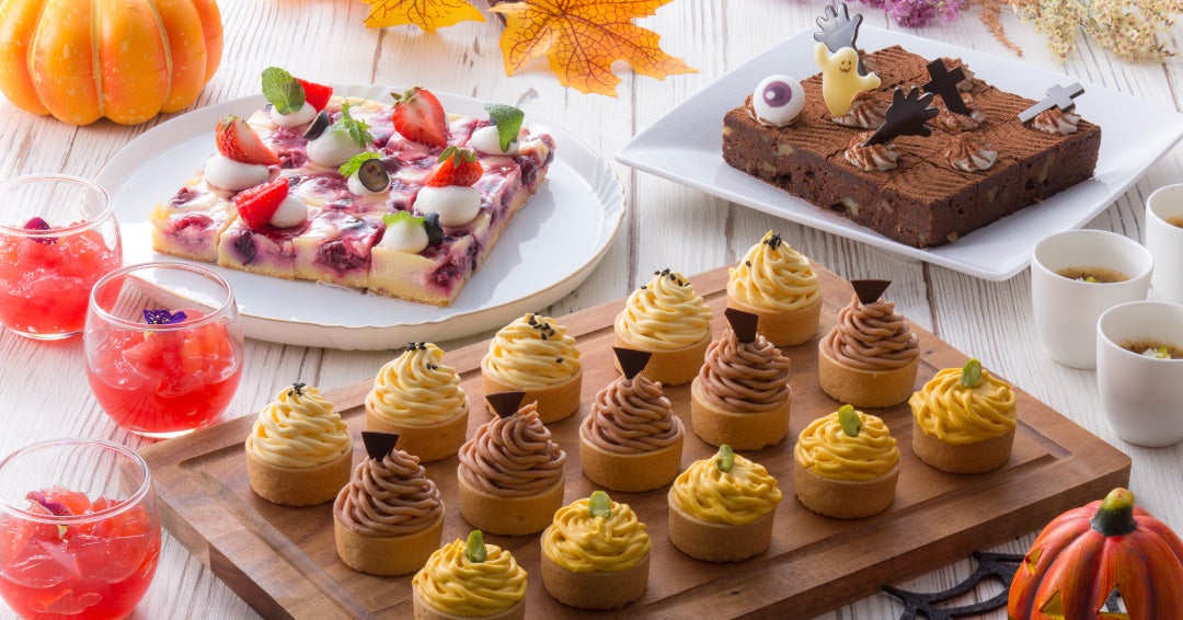 “実りの秋”に欠かせないマロンやカボチャ、スイートポテトといった秋の味覚を堪能できる全14種類のスイーツが登場いたします。スイートポテト、マロン、パンプキンのクリームをタルト生地の上に絞り、モンブラン状に仕上げた「3種のモンブラン~ハロウィンパーティ~」には、ホテル敷地内で養蜂し採取したはちみつ「ポートピアハニー」を使用。他にも、カボチャのタルトやマロンクリームのブリュレ、赤い果実のクラフティなど、ホテルパティシエ特製の秋ならではのスイーツを心ゆくまでご堪能いただけます。