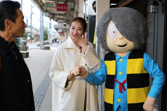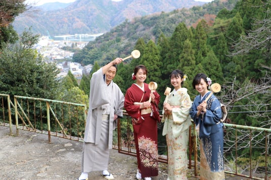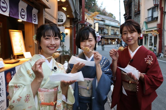 晴れ着姿の斉藤雪乃・小塚舞子・吉川亜樹とともに城崎温泉を巡ります。